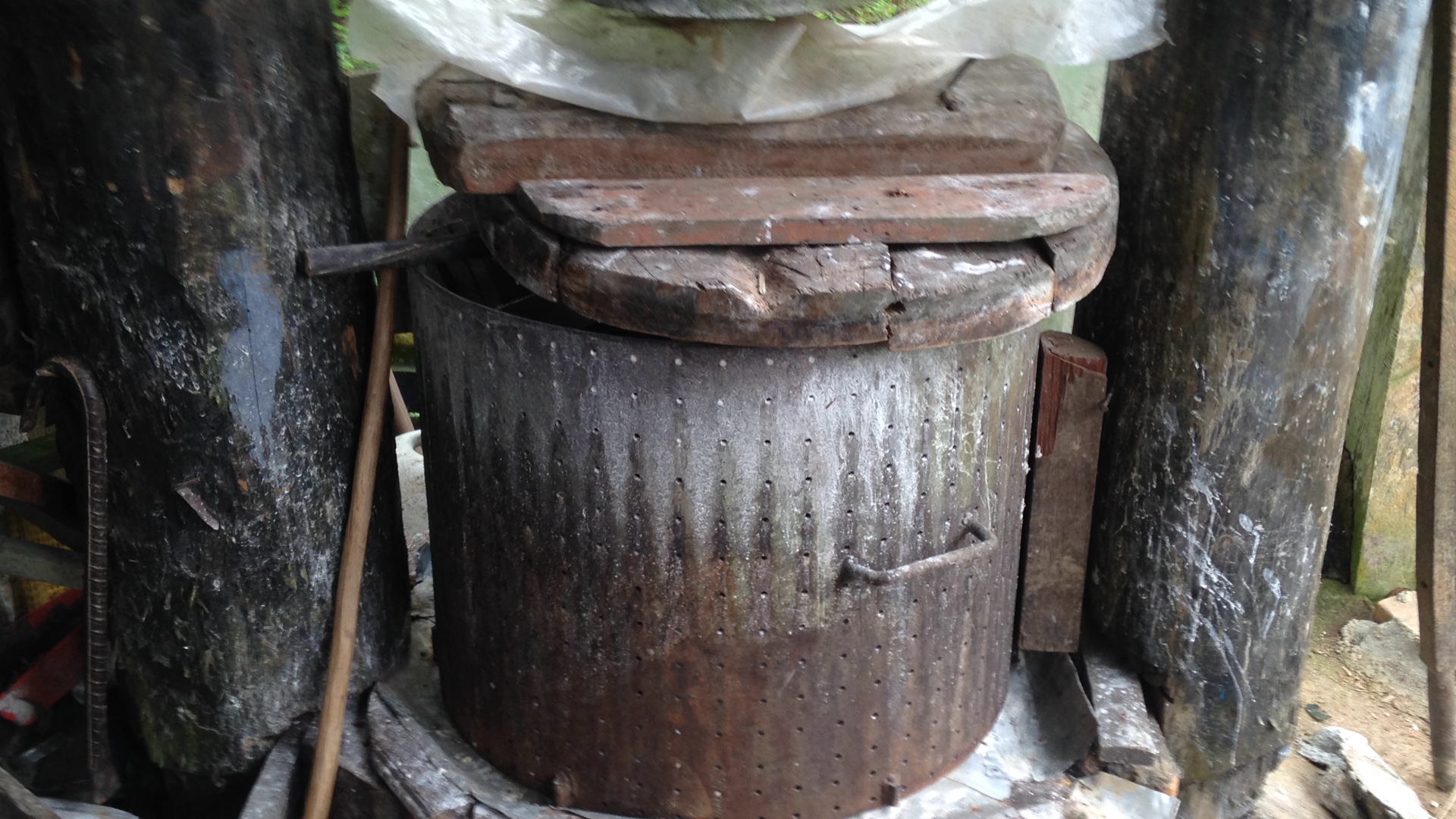 Em uma pequena casa, com aproximadamente 12m2, estão os seus instrumentos para descascar, cevar (moer), secar, torrar e armazenar a farinha de mandioca. Em um dia bão, seu Alcides diz que chega a produzir até 100kg de farinha.